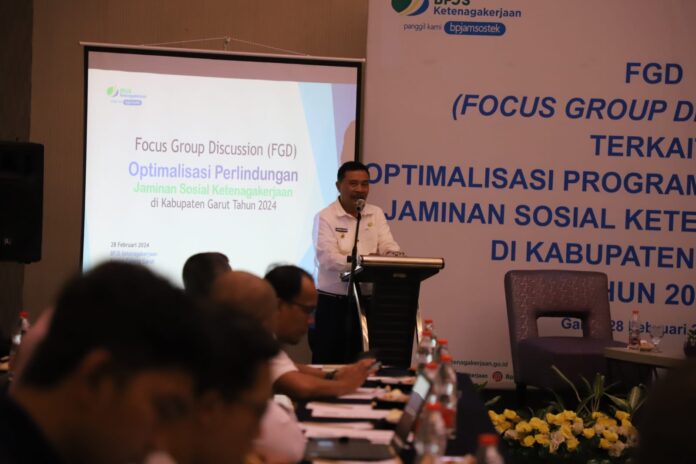 GARUT – Badan Penyelenggara Jaminan Sosial (BPJS) Ketenagakerjaan menggelar Focus Group Discussion (FGD) terkait Optimalisasi Program Perlindungan Jaminan Sosial Ketenagakerjaan (Jamsostek) di Kabupaten Garut Tahun 2024, di Ballroom Hotel Harmoni, Jalan Cipanas Baru, Kecamatan Tarogong Kaler, Kabupaten Garut, Rabu (28/02/2024).