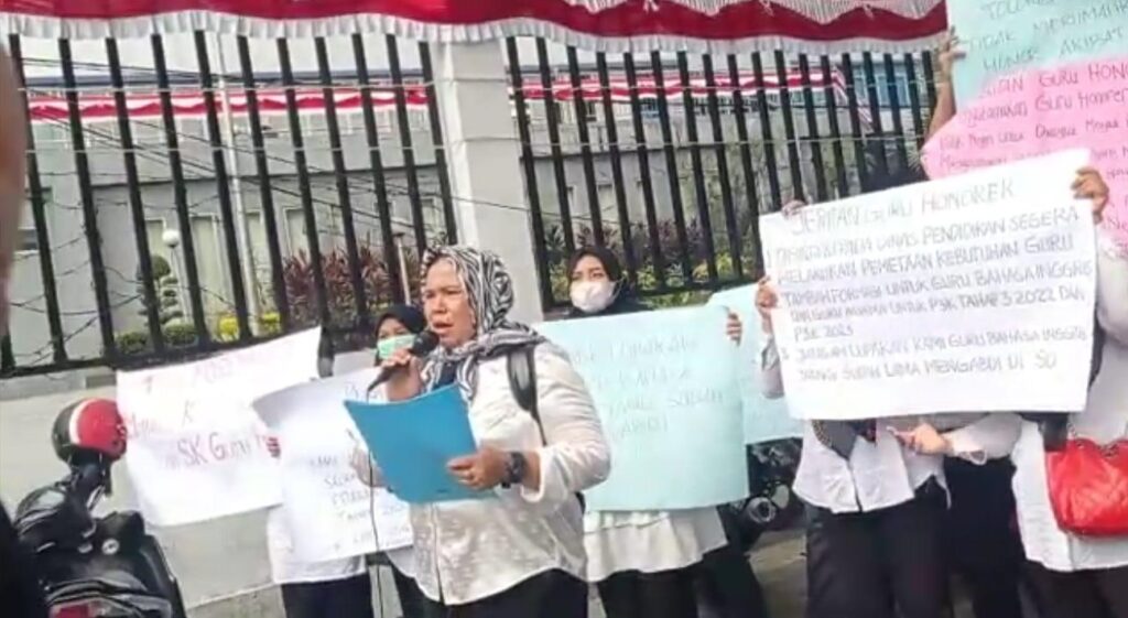 MEDAN – Puluhan guru honorer yang tergabung di Forum Guru Tidak Tetap (FGTT) menggelar unjukrasa di depan kantor DPRD Medan, Senin (27/6/22). Tenaga pendidik di Kota Medan ini meminta agar DPRD Medan peduli untuk memperjuangkan nasib guru yang terancam dipecat akibat masuknya guru Pegawai Pemerintah Dengan Perjanjian Kerja (P3K).