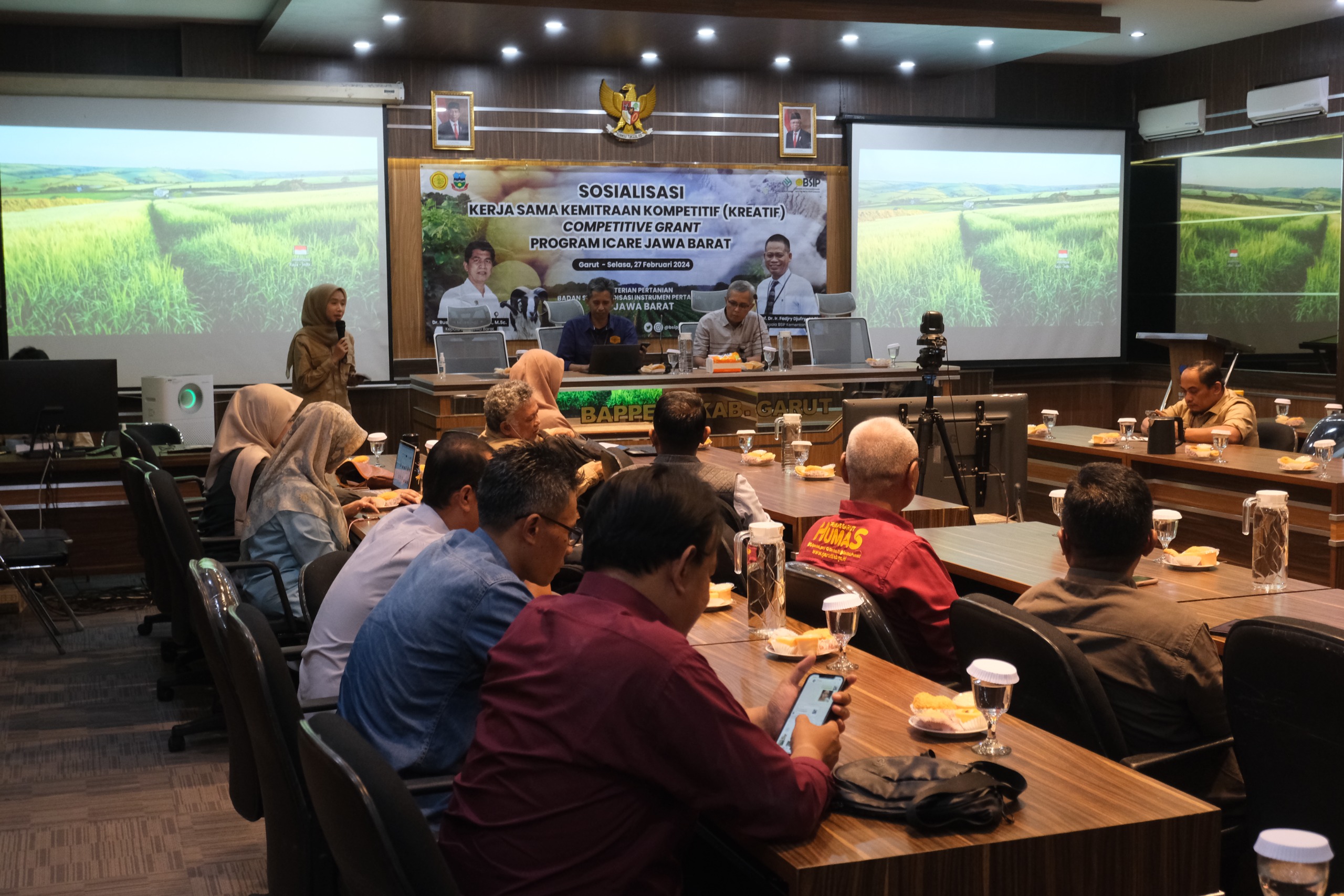 GARUT – Balai Penerapan Standar Instrumen Pertanian (BPSIP) Jawa Barat Kementerian Pertanian (Kementan) Republik Indonesia menggelar acara Sosialisasi Kerja Sama Kemitraan Kompetitif (KREATIF) Competitive Grant Program ICARE (Integrated Corporation Agricultural Resources Empowerment) Jawa Barat, di Aula Badan Perencanaan Pembangunan Daerah (Bappeda) Kabupaten Garut, Selasa (27/02/2024).