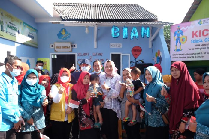 GARUT – Ketua Tim Penggerak Pemberdayaan Kesejahteraan Keluarga (TP PKK) Kabupaten Garut, Diah Kurniasari mengunjungi kegiatan bulan penimbangan imunisasi anak nasional (BIAN) di Posyandu Delima 2, Desa Ngamplangsari, Kecamatan Cilawu, Kabupaten Garut, Selasa (2/8/22).