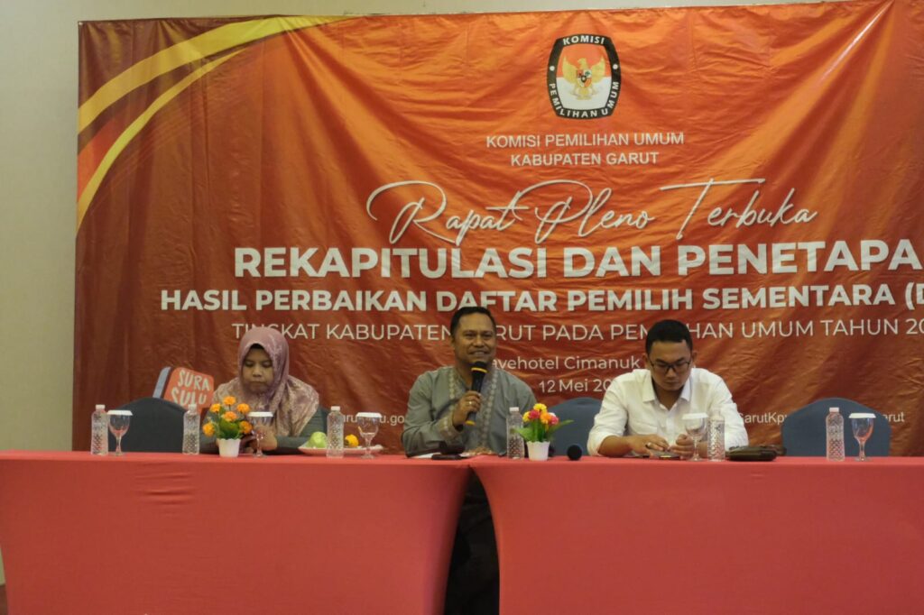 GARUT – Komisi Pemilihan Umum Daerah (KPUD) Kabupaten Garut menyelenggarakan Rapat Pleno Terbuka Rekapitulasi dan Penetapan Daftar Pemilih Sementara Hasil Perbaikan (DPSHP) Tingkat Kabupaten Garut di Ballroom Kassiti Fave Hotel, Jalan Cimanuk, Kecamatan Tarogong Kidul, Kabupaten Garut, Jum’at (12/5/2023).