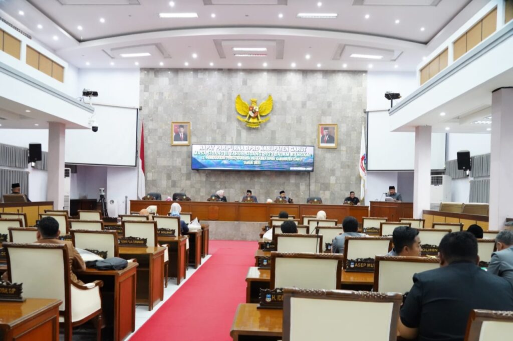 GARUT – Bupati Garut, Rudy Gunawan menghadiri Rapat Paripurna DPRD Masa Sidang III Tahun Sidang 2023 dalam rangka pembahasan Rancangan Peraturan Daerah (Raperda) Kabupaten Garut di Ruang Rapat Paripurna DPRD Garut, Jalan Patriot, Kecamatan Tarogong Kidul, Kabupaten Garut, Jumat 10 November 2023.