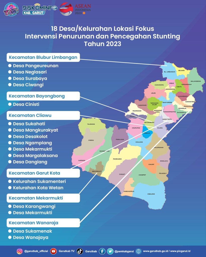Penetapan 18 desa dan kelurahan ini tertuang dalam Keputusan Bupati (Kepbup) Garut Nomor : 440/KEP.355-DINKES/2022 tentang Penetapan Desa/Kelurahan sebagai Lokus Intervensi Penurunan dan Pencegahan Stunting Tahun 2023 yang terbit pada tanggal 17 Juni 2022.
