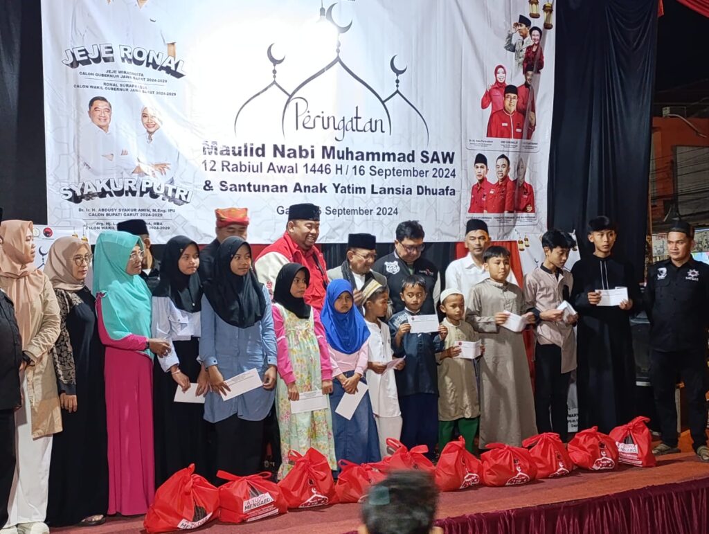 GARUT – DPC PDI Perjuangan Kabupaten Garut, mengundang banyak anak yatim dan lansia dhuafa di peringatan Maulid Nabi yang digelar Senin malam 16 September 2024 di kantor DPC PDIP Garut jalan Merdeka, Haurpanggung, Kecamatan Tarogong Kidul.
