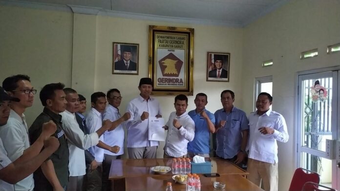 GARUT – Rhesa Yogaswara, mendaftar ke partai Gerindra DPC Kabupaten Garut, Senin 24 Juni 2024 sebagai bakal calon bupati Garut.