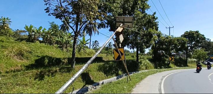 “Saya berharap kepada dinas terkait benarkan dan benahi kembali tiang lampu PJU ini karena ini jalan nasional dan dibutuhkan pengguna jalan saat malam hari,”katanya.