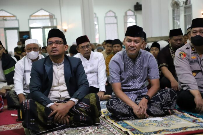 GARUT – Wakil Bupati (Wabup) Garut, dr. Helmi Budiman, melaksanakan Salat Iduladha 1443 Hijriah sekaligus menjadi khotib, di Masjid Besar Kaum, Kecamatan Limbangan, Kabupaten Garut, Minggu (10/7/22).