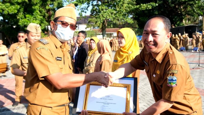 GARUT – Wakil Bupati Garut Helmi Budiman menyerahkan penghargaan Sekolah Adiwiyata Tingkat Kabupaten Garut 2023 di saat apel gabungan di lapangan Setda Garut, Senin 12 Juni 2023.