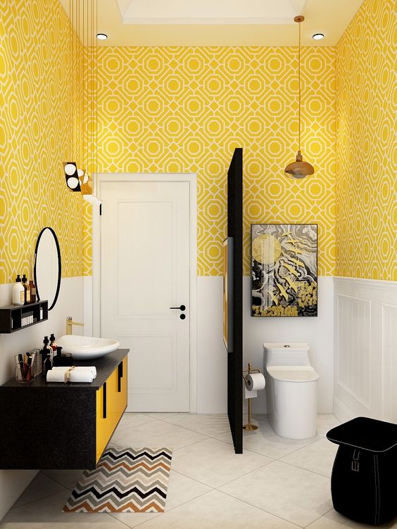 Warna kuning akan mengesankan semangat, cerah dan keceriaan. Selain itu warna kuning akan membuat kita betah di kamar mandi.